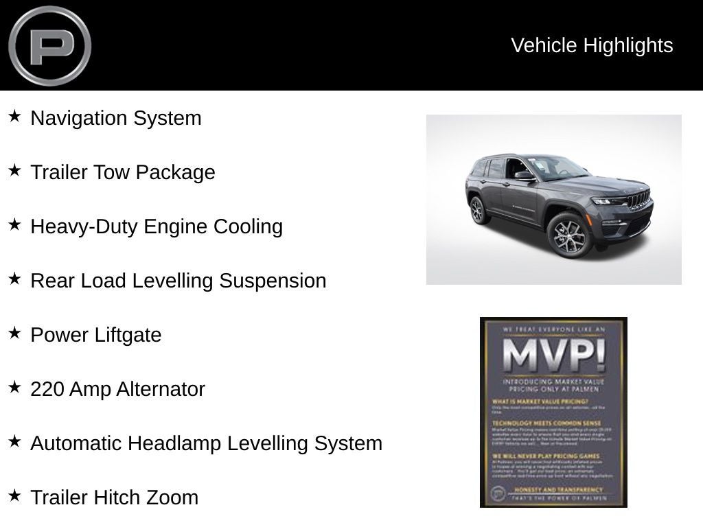4WD, 220 Amp Alternator, 7 & 4-Pin Wiring Harness, Automatic Headlamp Levelling System, Class IV Receiver Hitch, Heavy-Duty Engine Cooling, Navigation System, Power Liftgate, Rear Load Levelling Suspension, Trailer Hitch Zoom, Trailer Tow Package. Price includes the following incentives, not all customers may qualify. See dealer for details.: $1000 - 2025 Midwest BC Bonus Cash . Exp. 03/31/2026 $2000 - 2025 National Bonus Cash . Exp. 03/31/2026 $2250 - 2025 National Retail Bonus Cash . Exp. 03/31/2026