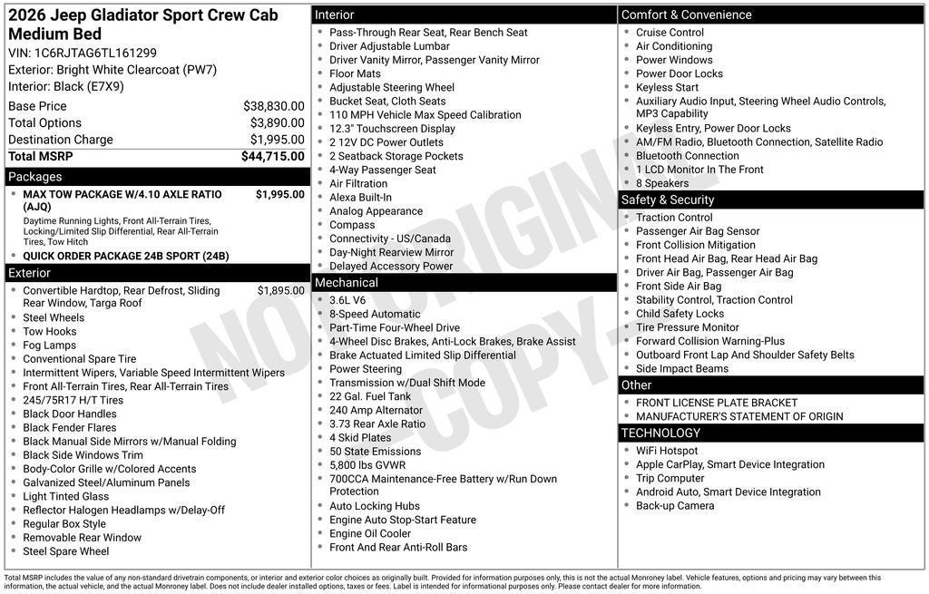 Discover the true meaning of freedom and capability in the 2026 Jeep Gladiator Sport. Visit our showroom today and let us demonstrate why this iconic Jeep is the ultimate choice for your next adventure. Price includes the following incentives, not all customers may qualify. See dealer for details.: $1000 - 2026 Midwest BC Bonus Cash . Exp. 03/31/2026