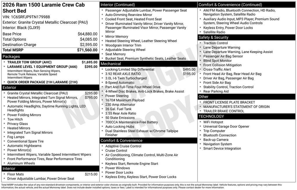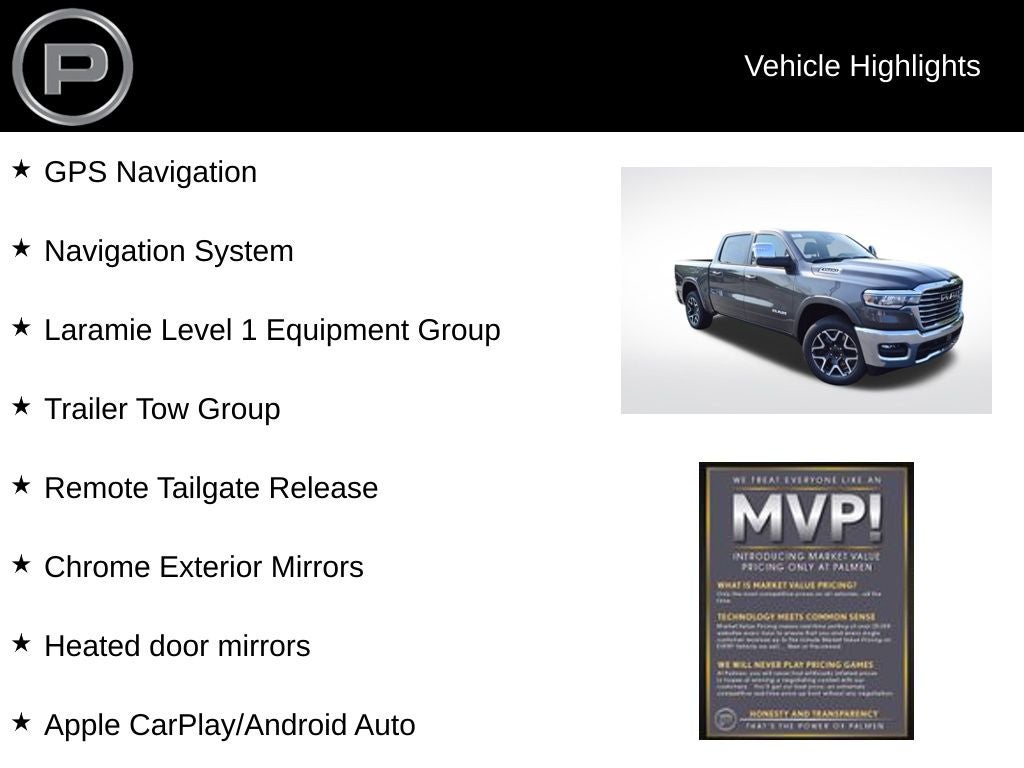 Whether you're seeking a capable work truck, a family-friendly hauler, or a versatile adventure partner, the 2026 Ram 1500 Laramie is the ultimate choice. Experience the perfect blend of power, technology, and refinement that will elevate your driving experience. Visit our showroom today to discover why the Ram 1500 Laramie is the perfect fit for you. Price includes the following incentives, not all customers may qualify. See dealer for details.: $3500 - 2026 National Retail Bonus Cash . Exp. 04/30/2026 $500 - 2026 National 2026 First Responder Bonus Cash . Exp. 01/04/2027 $500 - 2026 National 2026 Military Bonus Cash . Exp. 01/04/2027