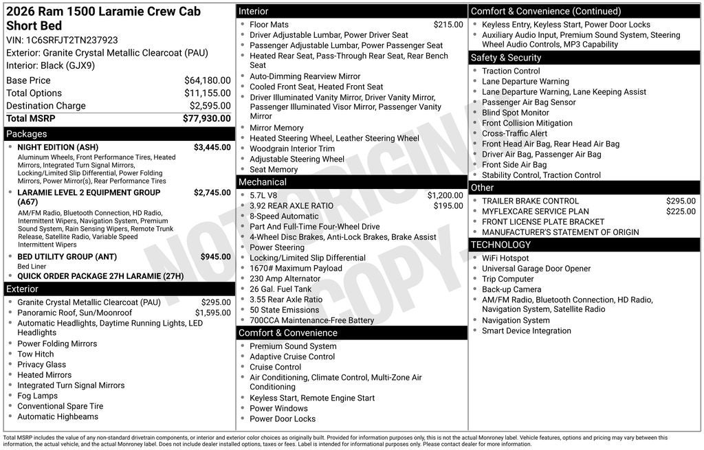 Designed for both work and play, the 2026 Ram 1500 Laramie offers a remarkable blend of capability and refinement. The Bed Utility Group, including a MOPAR Spray-in Bedliner and adjustable cargo tie-down hooks, ensures your cargo is securely transported. Meanwhile, the premium interior features leather-trimmed bucket seats, a heated steering wheel, and ventilated front seats for unparalleled comfort.