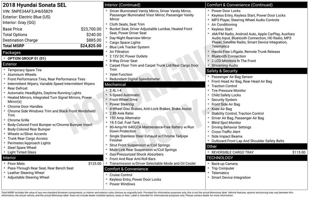 Powered by a reliable 2.4L 4-cylinder engine paired with a smooth 6-speed automatic transmission, the Sonata SEL offers impressive MPG and a refined ride. Enjoy convenient features like heated front seats, HD Radio with SiriusXM, Bluetooth® connectivity, backup camera, Rear Cross-Traffic Alert, and Hyundai Blue Link® technology. The spacious cabin and generous trunk make this sedan practical for work, school, or road trips.