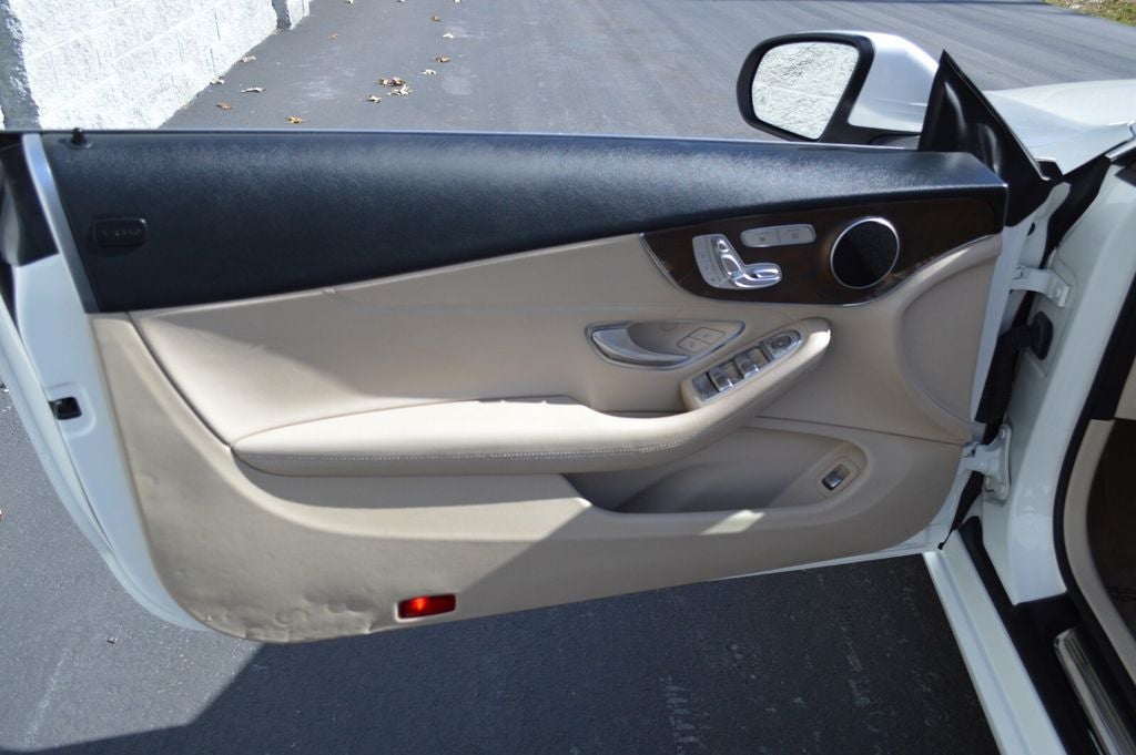 Finished in timeless Polar White with a Macchiato Beige/Black MB-Tex interior, this C-Class offers true sophistication. Enjoy comfort and craftsmanship with heated front seats, natural wood trim, power convertible top, and dual-zone climate control. Technology features include Bluetooth®, rearview camera, Blind Spot Assist, and two LCD displays for seamless connectivity and control.