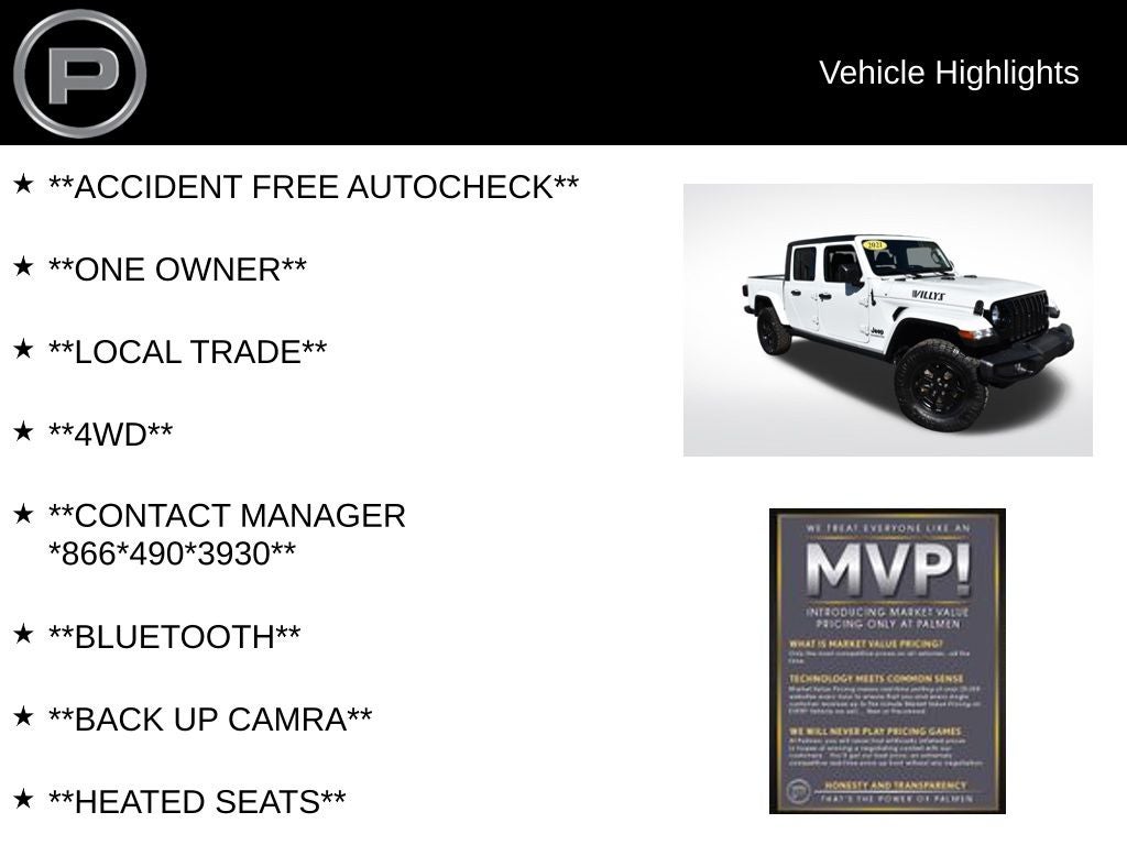 Turn heads on and off the road in this 2021 Jeep Gladiator Willys 4x4, available now at Palmen Motors and Palmen Kia in Kenosha, Wisconsin. Finished in Bright White with a rugged black interior, this Gladiator delivers legendary Jeep capability with everyday comfort and utility.