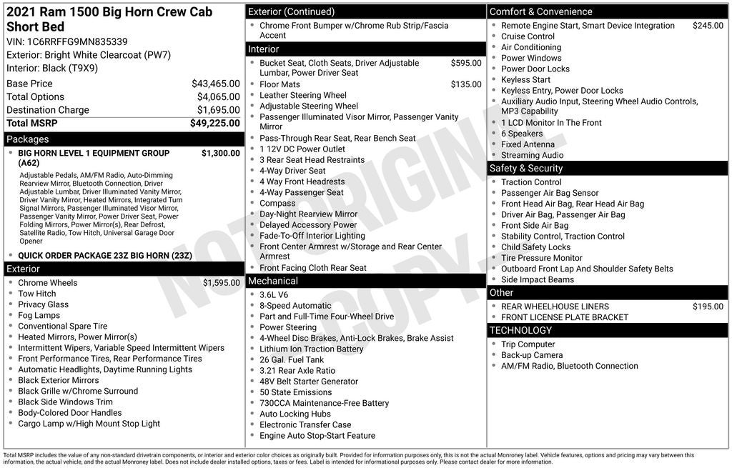 May not represent actual vehicle. (Options, colors, trim, and body style may vary) Dealer is not responsible for any typographical errors. *Any MPG listed is based on model year EPA mileage ratings. Use for comparison purposes only. Your actual mileage will vary, depending on how you drive and maintain your vehicle, driving conditions, battery pack age/condition (hybrid only) and other factors. We attempt to update our website in a timely manner however neither Stellantis nor the dealer can guarantee that the inventory shown will be available at the dealership. We cannot be responsible for typographical and other errors, including data transmissions or software errors that may appear on the site. If the posted price, incentive, offer, or other service is incorrect due to typographical or other error we will only be responsible for honoring the correct price, incentive or offer. We make every effort to provide you the most accurate, up-to-the-minute information however when you are ready to purchase products or services, it is your responsibility to verify with us that all details listed are accurate. *No Payments for 90-Days . No payments for 90-days on select certified vehicles through Stellantis Financial Services. No payments compatible with up to 84-Month Financing. To qualified buyers with approved credit. See Dealer For Details. Max payload/towing estimate ratings shown. Additional options, equipment, passengers, and cargo weight may affect payload/towing weights. See dealer for details. The Manufacturer's Suggested Retail Price excludes tax, title, license, dealer fees and optional equipment. Dealer sets final price.
