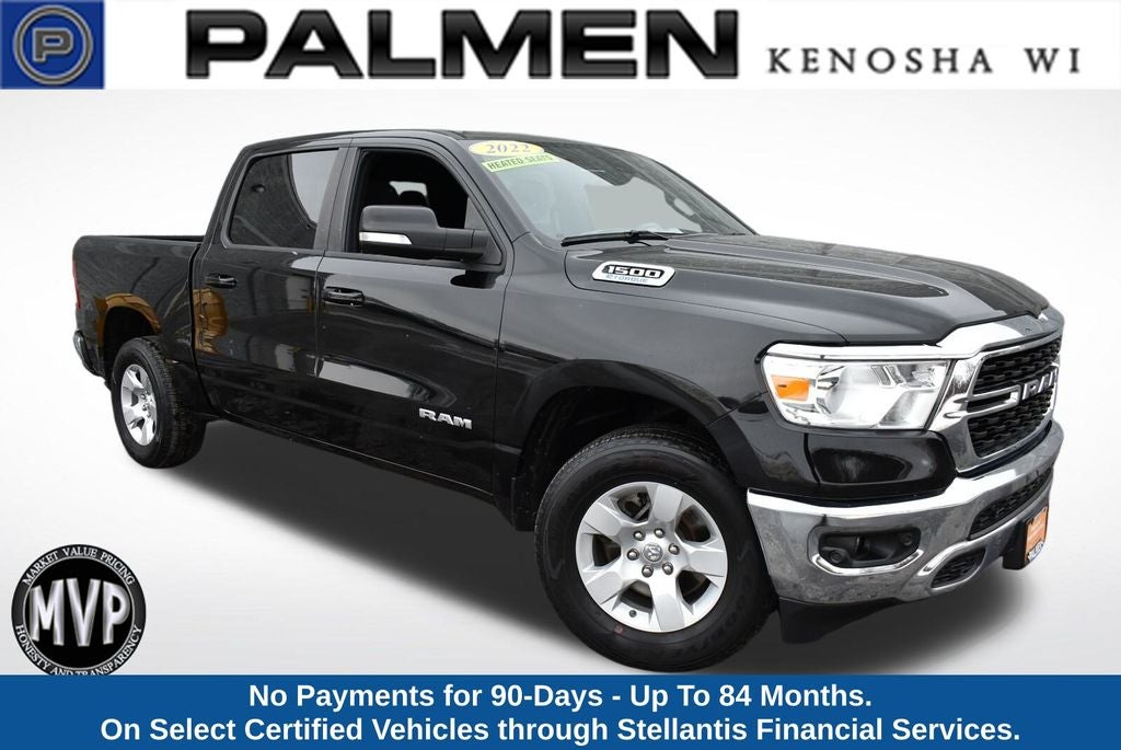 Now available at Palmen Kia and Palmen Motors in Kenosha, WI, this 2022 Ram 1500 Big Horn Crew Cab 4x4 delivers the perfect mix of power, comfort, and everyday capability. Finished in sleek Diamond Black Crystal Pearlcoat with a black interior, this full-size pickup is powered by a dependable V6 engine paired with a smooth automatic transmission and capable 4x4, making it ideal for Wisconsin winters, job sites, and weekend towing.