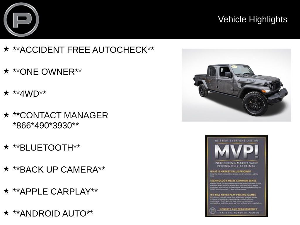 Visit Palmen Kia / Palmen Motors in Kenosha, Wisconsin today to test drive this capable and unique Jeep Gladiator Willys and experience unmatched versatility and Jeep performance.