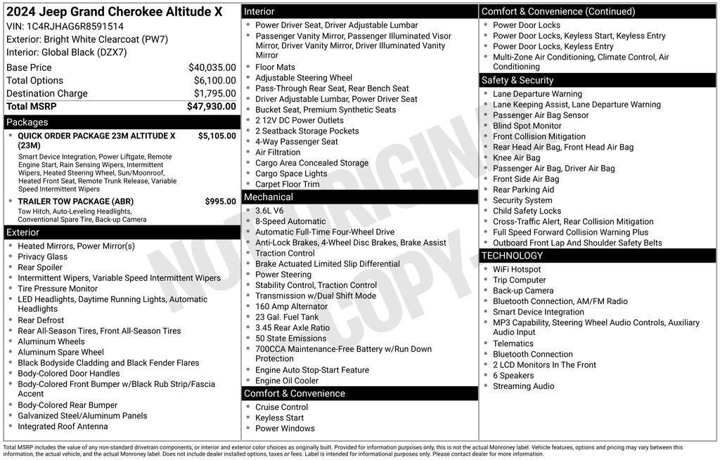 Elevate your drive with this 2024 Jeep Grand Cherokee Altitude X 4x4 in Bright White, available now at Palmen Kia and Palmen Motors. Powered by a strong V6 engine with full-time 4x4 capability, this SUV is built for Wisconsin winters and Illinois road trips alike. Enjoy modern features like Uconnect, advanced safety systems with blind-spot detection, forward collision warning, and premium comfort with power seating and dual-zone climate control.