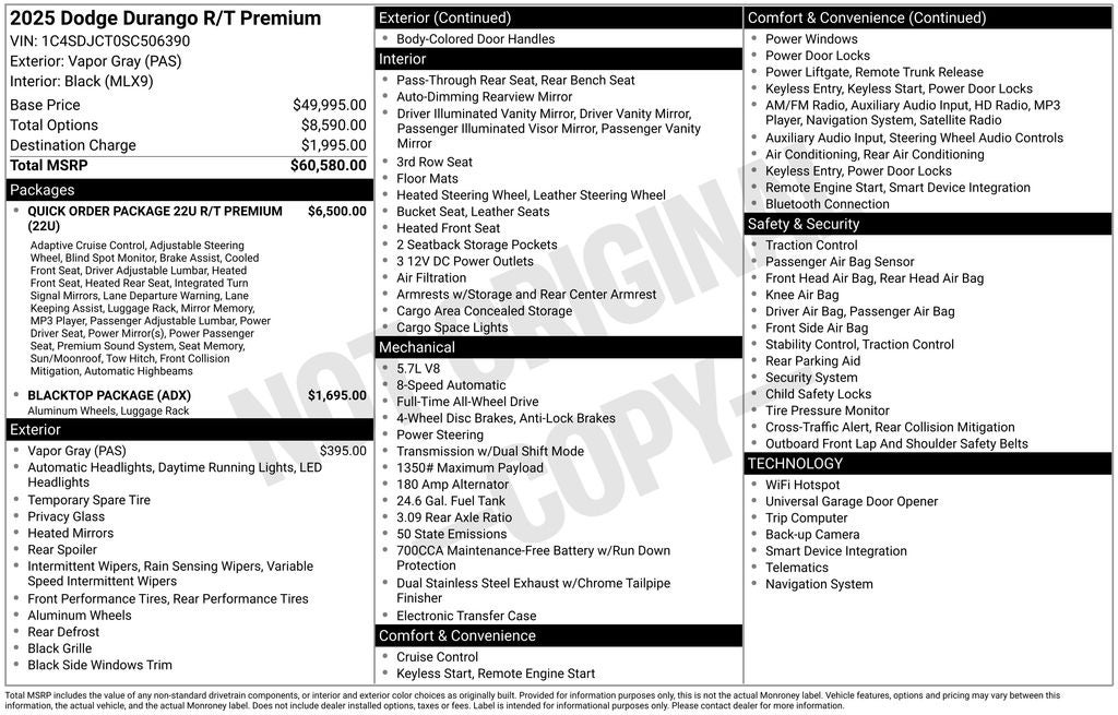 Built for drivers who want muscle and versatility, this Durango R/T Premium features dual stainless steel exhaust with chrome tips, rear load leveling suspension, electronic transfer case, and a 3.09 rear axle ratio for confident towing and handling. The available Blacktop Package adds aggressive styling, while the spacious 3-row interior offers 60/40 split-folding rear seating and generous cargo space.